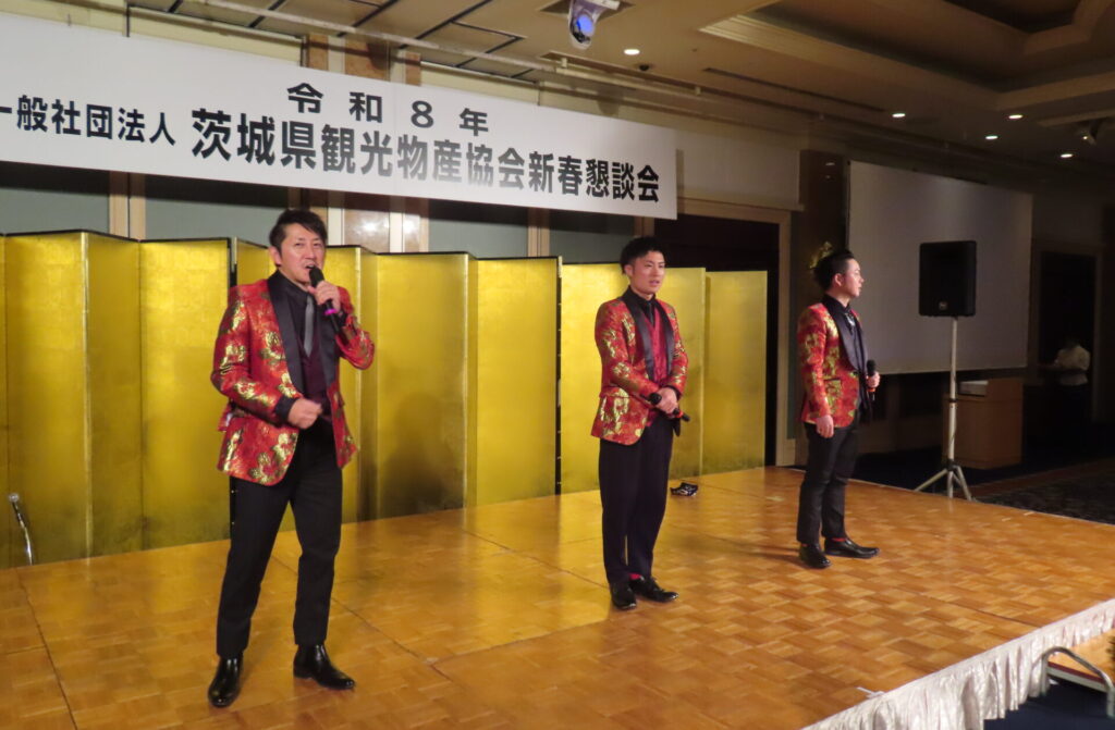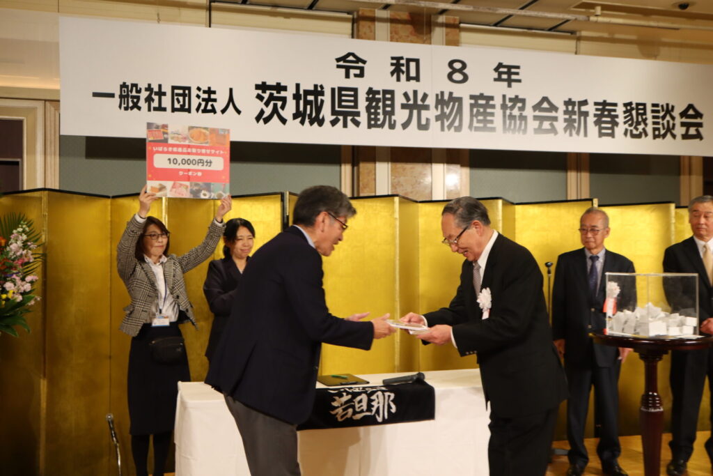 また、茨城県の観光応援隊として観光宣伝で大活躍の「いばらき若旦那」のミニステージや、県産品お取り寄せクーポンが当たる「お楽しみ抽選会」もあり、新春らしい華やかな会となりました。