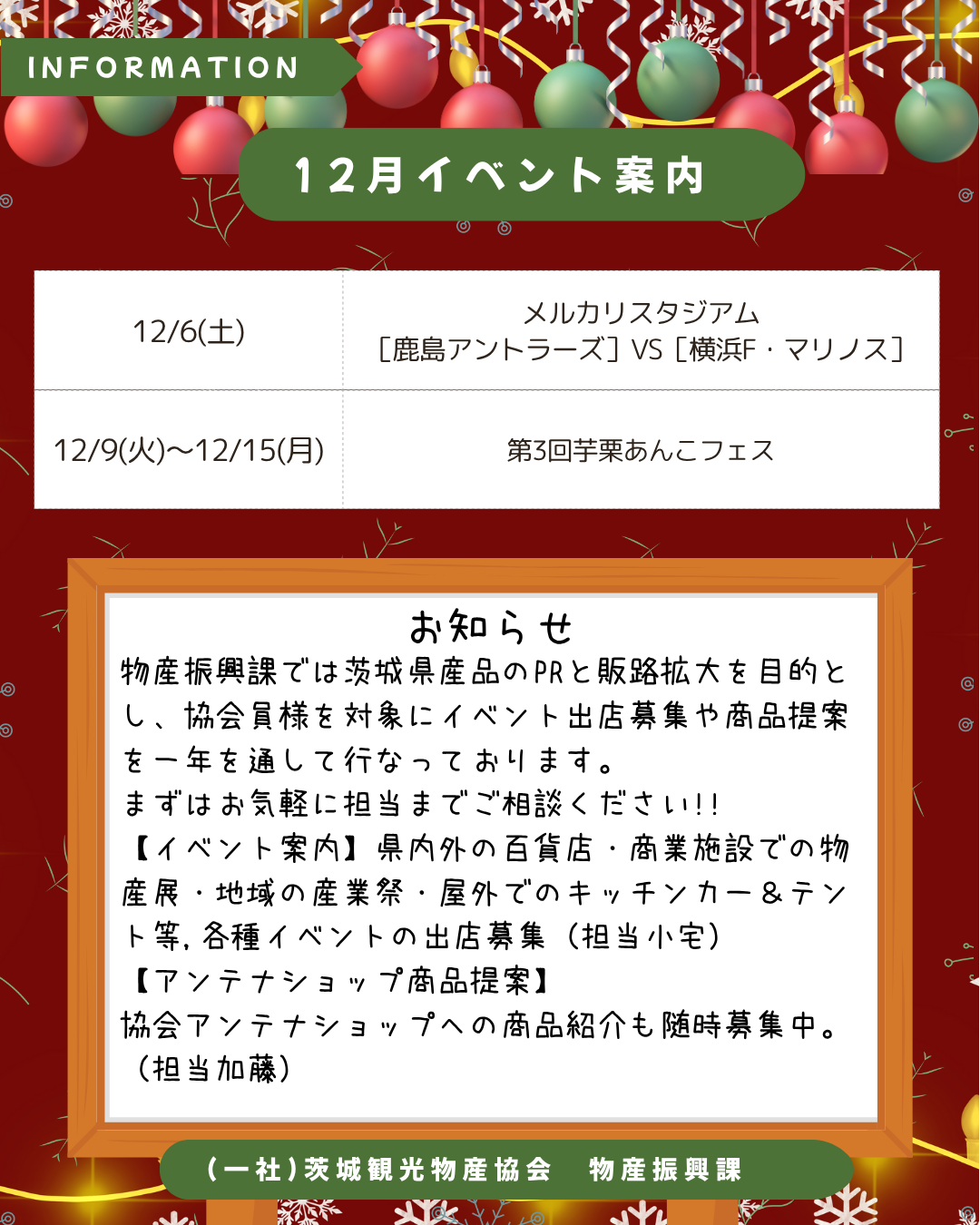 物産振興課では茨城県産品のPRと販路拡大を目的とし、協会員様を対象にイベント出店募集や商品提案を一年を通じて行なっております。まずはお気軽に担当までご相談ください!!