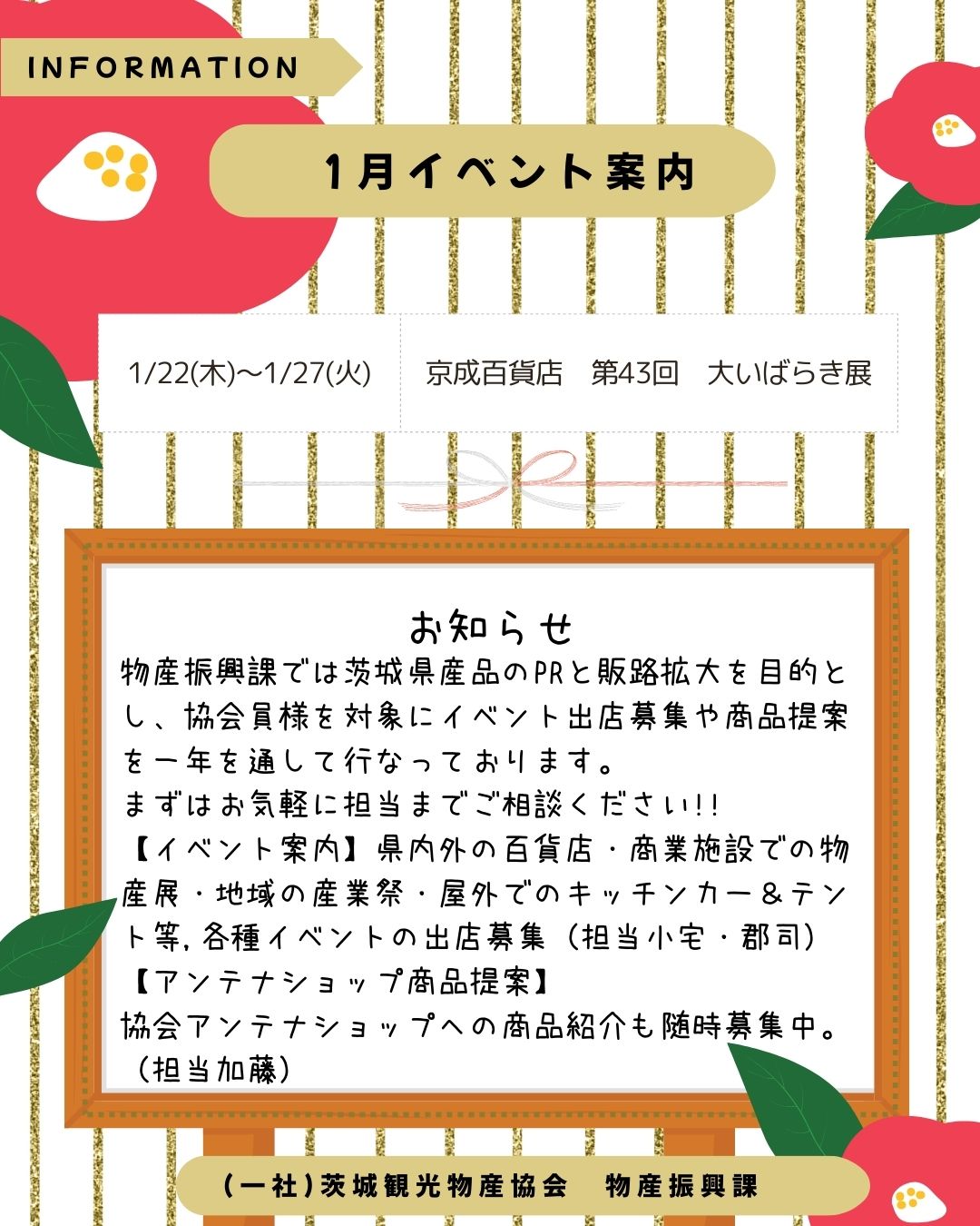 物産振興課では茨城県産品のPRと販路拡大を目的とし、協会員様を対象にイベント出店募集や商品提案を一年を通じて行なっております。まずはお気軽に担当までご相談ください!!